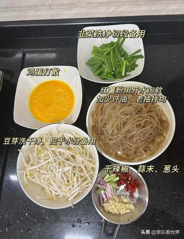 1. 鸡蛋打散;韭菜洗净切段;豆芽洗净控干;红薯粉用开水泡软,加少许油、老抽拌匀。