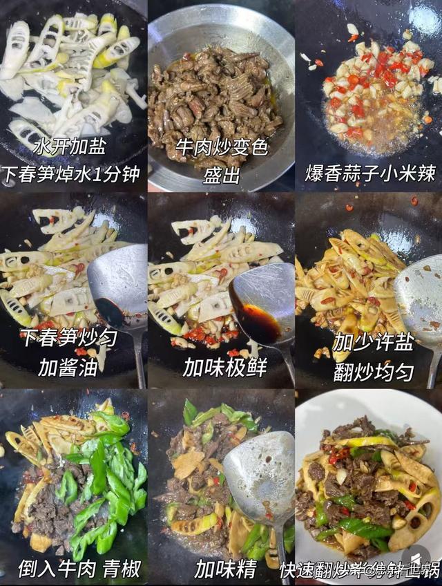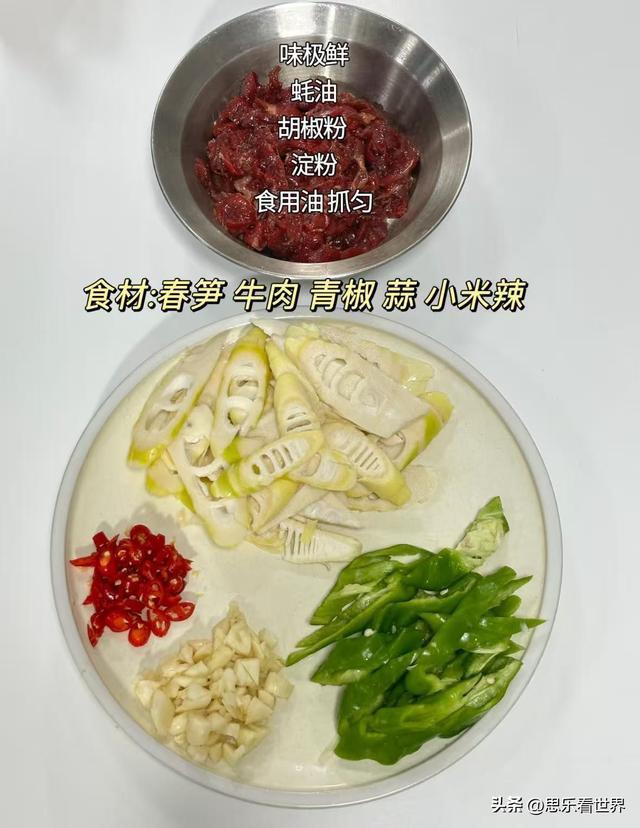 春笋、牛肉、青椒、蒜、小米辣;调味:味极鲜、蚝油、胡椒粉、淀粉、食用油、酱油、盐、味精