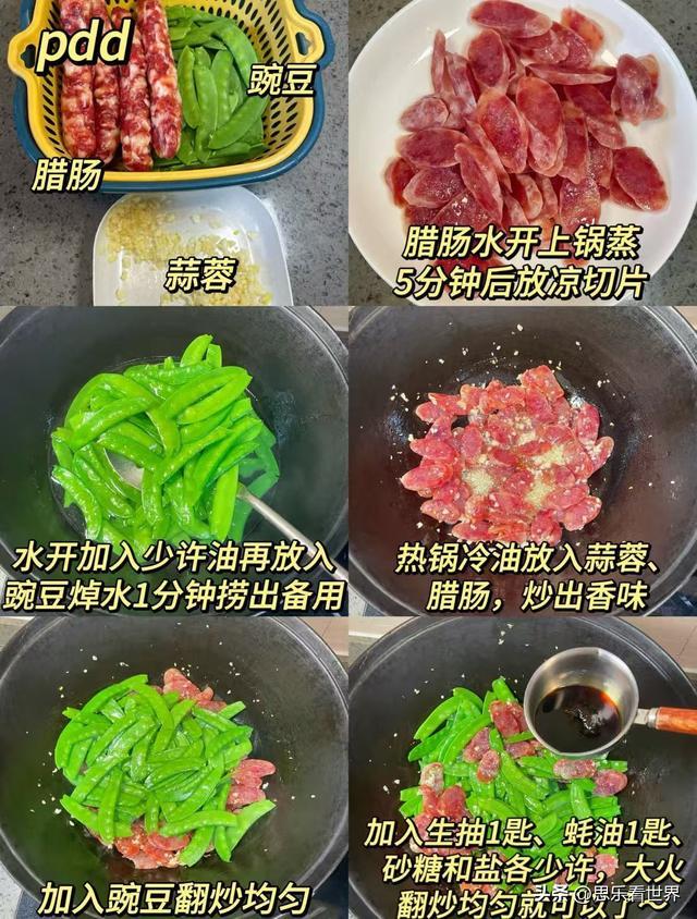 荷兰豆脆嫩清甜,腊肠咸香不腻,荤素搭配,鲜醇可口,老人小孩都爱吃。