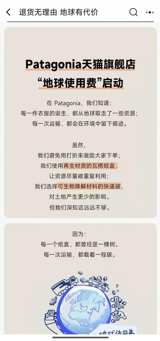 该品牌方在社媒发布14页内容解释“地球使用费”,提到2025年双11期间,退货率高达69.7%,2023-2025年巴塔哥尼亚天猫旗舰店因发货产生了190.36吨碳排放,退货而产生的快递产生了40.9吨碳排放……