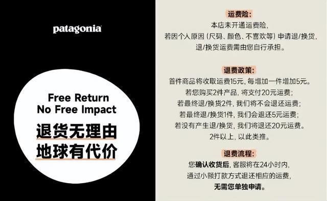 简言之,自4月份开始,消费者在该品牌官方旗舰店购买衣服后,首件商品将收取运费15元,每增加一件增加5元,若顾客没有退货,店铺将退还费用;若顾客退/换货,将扣除15元运费,所有未被退还的快递费用将捐赠给环保公益项目。