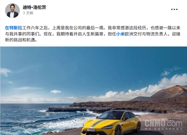 【CNMO科技消息】4月7日,据《电动知家》公众号报道,小米已聘请特斯拉中欧地区交付运营高级经理迪特·洛伦茨(Dieter Lorenz)担任其欧洲交付与物流负责人。此外,至少还有一名特斯拉欧洲运营人员一起加入了小米。